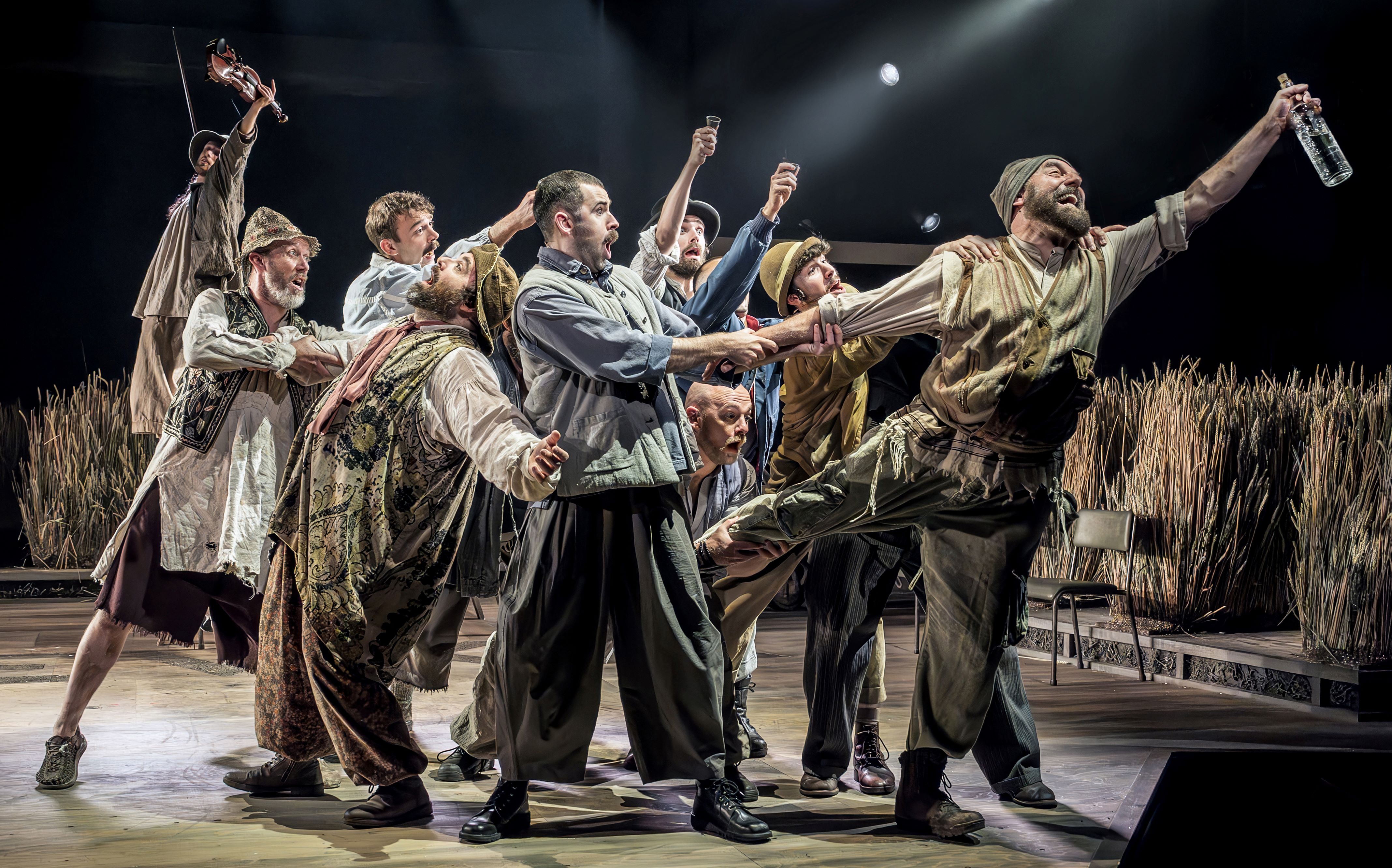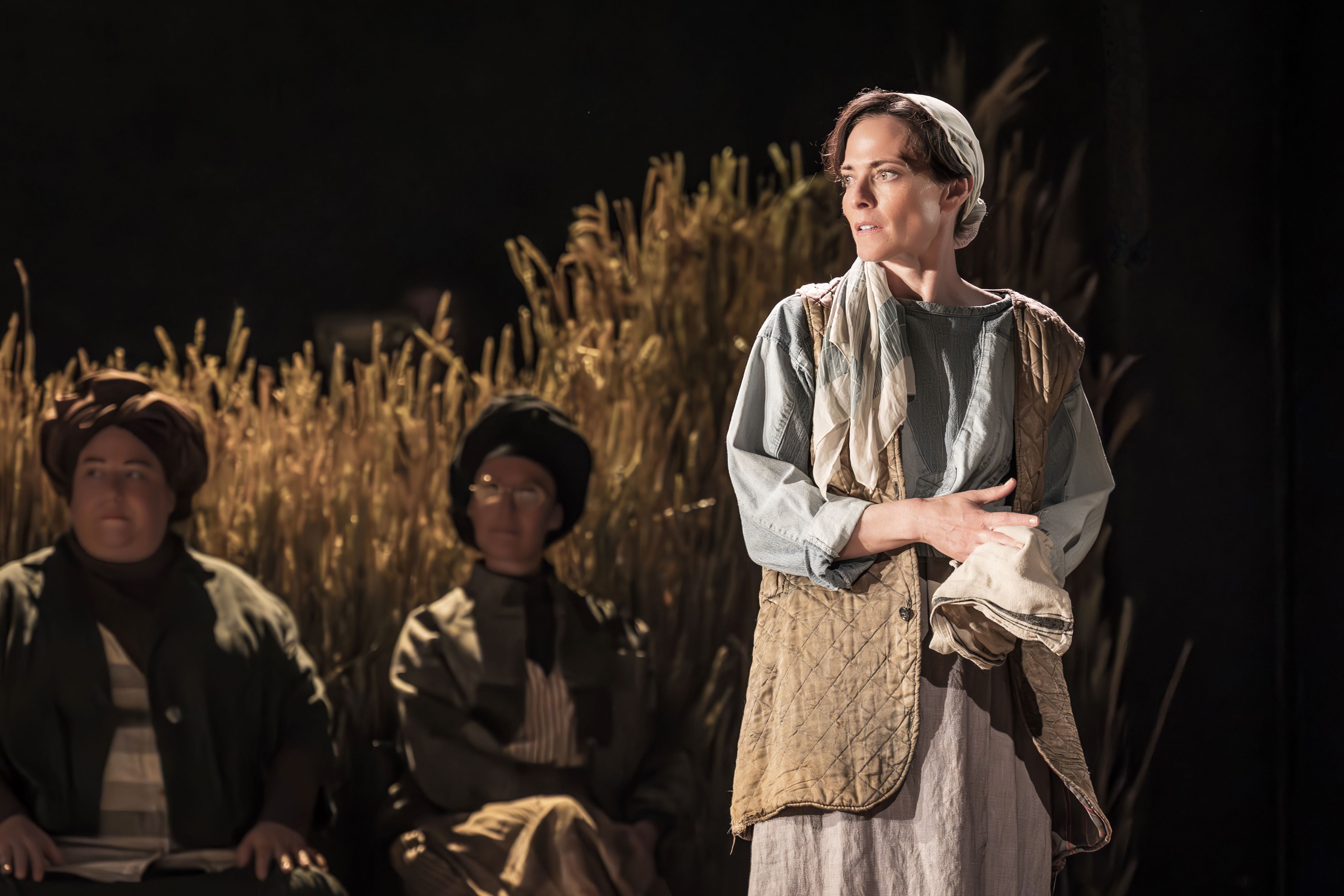 Neben dem innerfamiliären Konflikt tritt im zweiten Akt zunehmend das Thema politischer Druck und Zwangsvertreibung in den Vordergrund. Auch hier bleibt die Inszenierung reduziert, fast nüchtern – und gerade dadurch umso eindringlicher. Die Bühne verändert sich formal nicht, wirkt aber zunehmend enger und bedrückender. Das Bühnenbild von Moi Tran verstärkt diese Entwicklung wirkungsvoll: Der Spielraum ist von hohen, goldenen Getreidefeldern an den Seiten eingefasst, darüber spannt sich ein flaches Dach aus Korn, in dessen Mitte ein abgestorbener Baum steht. Die wenigen Requisiten, die etwa Tevjes Haus oder das Gasthaus markieren, werden hereingetragen und verschwinden wieder – alles wirkt provisorisch, vergänglich. Mit fortschreitender Handlung senkt sich das Dach Stück für Stück ab und verengt den Raum optisch wie atmosphärisch. Besonders eindrücklich gelingt diese Verdichtung im Finale des ersten Akts: Als Zeichen staatlicher Machtdemonstration stürmen Polizisten mit Fackeln die Bühne, zerstören Mobiliar, reißen Dekorationen herunter. Während das Chaos seinen Höhepunkt erreicht, steigen Rauchschwaden aus dem Getreidedach auf, bevor die Felder an den Seiten und über den Köpfen blutrot zu glühen beginnen.