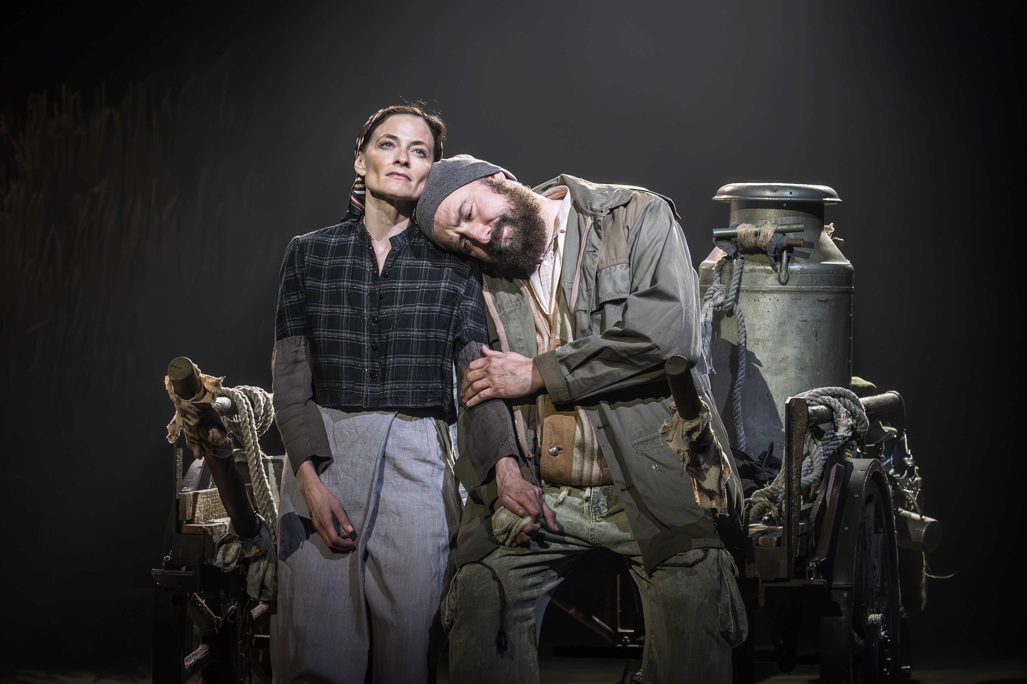 Beverley Klein ist als Heiratsvermittlerin Yente mit sichtlicher Spielfreude dabei. Ihre Szene rund um den Brief aus Sibirien gerät zum komödiantischen Höhepunkt: Weil sie den Brief längst gelesen hat, verbreitet sich durch ihre Plauderei ein immer absurderes Gerücht, das schließlich in der Behauptung gipfelt, Frauen würden jetzt mit Männern tanzen – und alles hätte mit Hodels Brief begonnen. Adam Dannheisser ist das emotionale Herzstück der Inszenierung. Er spielt Tevje als liebevollen, strengen Patriarchen, der seinen Töchtern letztlich doch keinen Wunsch abschlagen kann. Sein feiner Sinn für Humor zeigt sich besonders in der Zwiesprache mit Gott: Mimik, Timing und Gestik sind präzise gesetzt, nie zu viel – und lockern die sonst oft düstere Grundstimmung auf, ohne sie zu brechen. Ein Höhepunkt ist die Szene, in der Tevje vorgibt, von einem Albtraum heimgesucht worden zu sein: Mit sichtlicher Spielfreude „inszeniert“ er den Auftritt von Großmutter Tzeitel, die bestimmt, dass nicht Lazar Wolf, sondern der Schneider Mottel der richtige Bräutigam für seine Tochter Zeitel sei. Wie Dannheisser dabei das Ensemble anleitet, Übergänge steuert und den Traum im wahrsten Sinne selbst auf die Bühne bringt, ist präzise gebaut und komödiantisch auf den Punkt. Lara Pulver ist als Golde das ideale Gegenstück zu Tevje: bodenständig, beinahe stoisch, holt sie ihren aufbrausenden Ehemann immer wieder auf den Boden der Tatsachen zurück. Ohne große Gesten oder Emotionen spielt sie die starke Frau im Hintergrund – präsent, aber nie dominant. Gesanglich harmonieren Pulver und Dannheisser hervorragend, besonders in ihrem gemeinsamen Duett „Do You Love Me?“, das zu einem stillen, aber tief berührenden Moment des Abends wird.