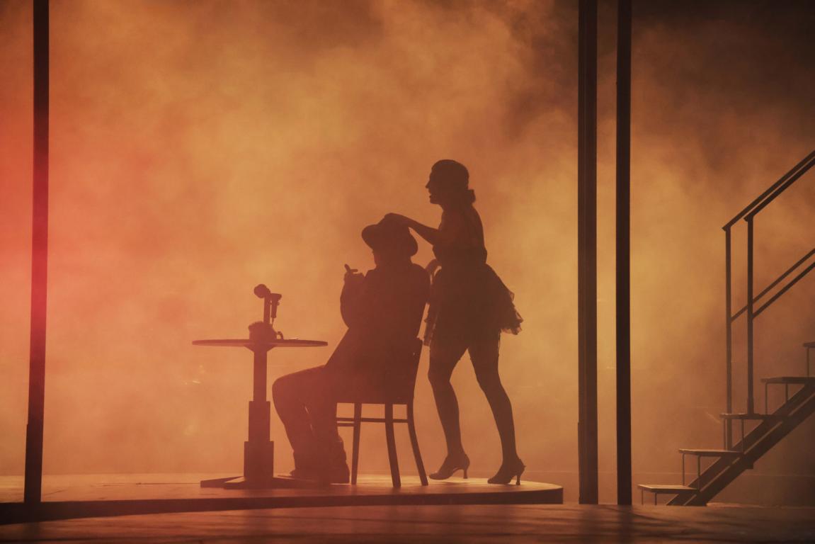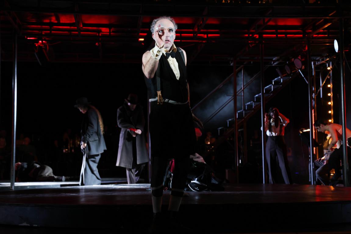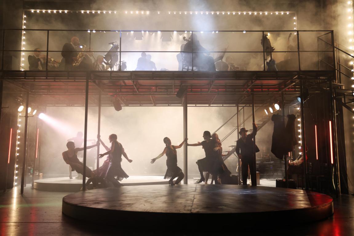 Gesungen wird teils auf Englisch, teils auf Deutsch – mit Übertitelung auf Englisch. Die Band (Musikalische Supervision: Yoel Gamzou) spielt live auf einem Gerüst über der Bühne. Schon das Bühnenbild (Harald Thor) ist außergewöhnlich: Gespielt wird zwischen zwei Zuschauerblöcken. Das Theatersaalpublikum blickt auf eine Bühne, auf der sich ein weiterer Publikumsblock mit entgegengesetzter Blickrichtung befindet – als KitKat Club-Gäste sind sie Teil des Geschehens. Zwischen beiden Blöcken rotieren zwei Drehbühnen, auf denen sich das Spiel abwechselt. Die Darsteller:innen bewegen sich permanent zwischen beiden Seiten, sprechen mal in diese, mal in die andere Richtung. Ein spannender Ansatz, der das Cabaret-Gefühl in alle Seiten ausdehnen will. Erschwert wird dieser Effekt jedoch durch gravierende tontechnische Mängel: Im Parkett geht spätestens mit Einsatz der Live-Instrumente vieles unter, was auf der gegenüberliegenden Seite gesagt oder gesungen wird. Auch wenn sich in dieser Inszenierung gleich zwei Conferenciers abwechseln und ergänzen – akustisch kommt oft nur die Hälfte an.