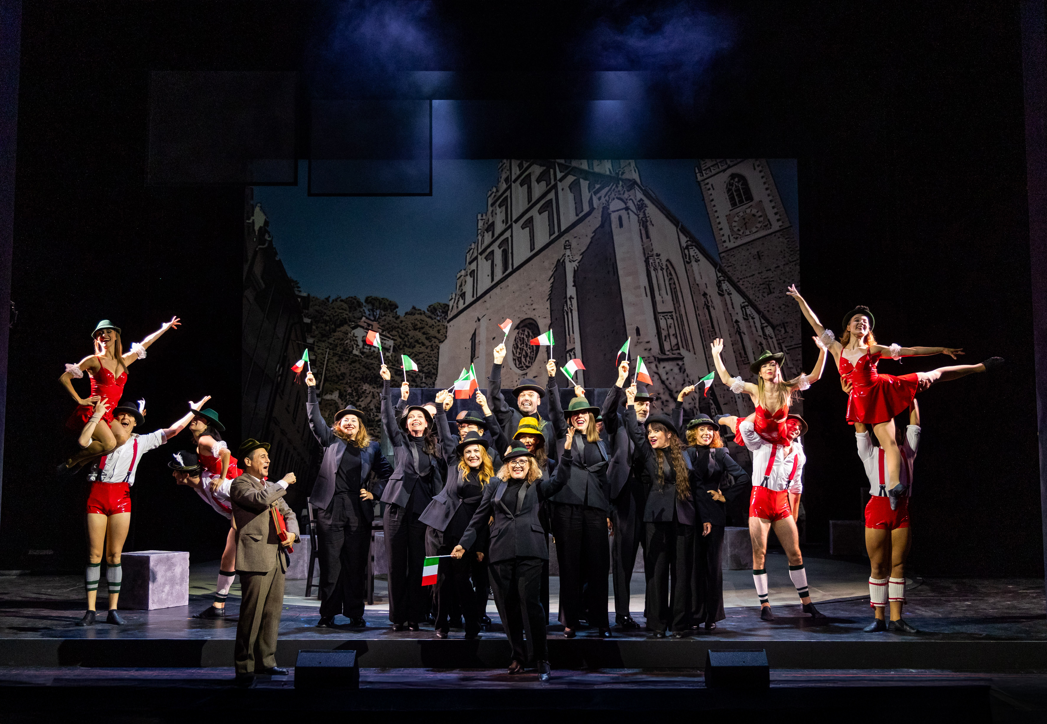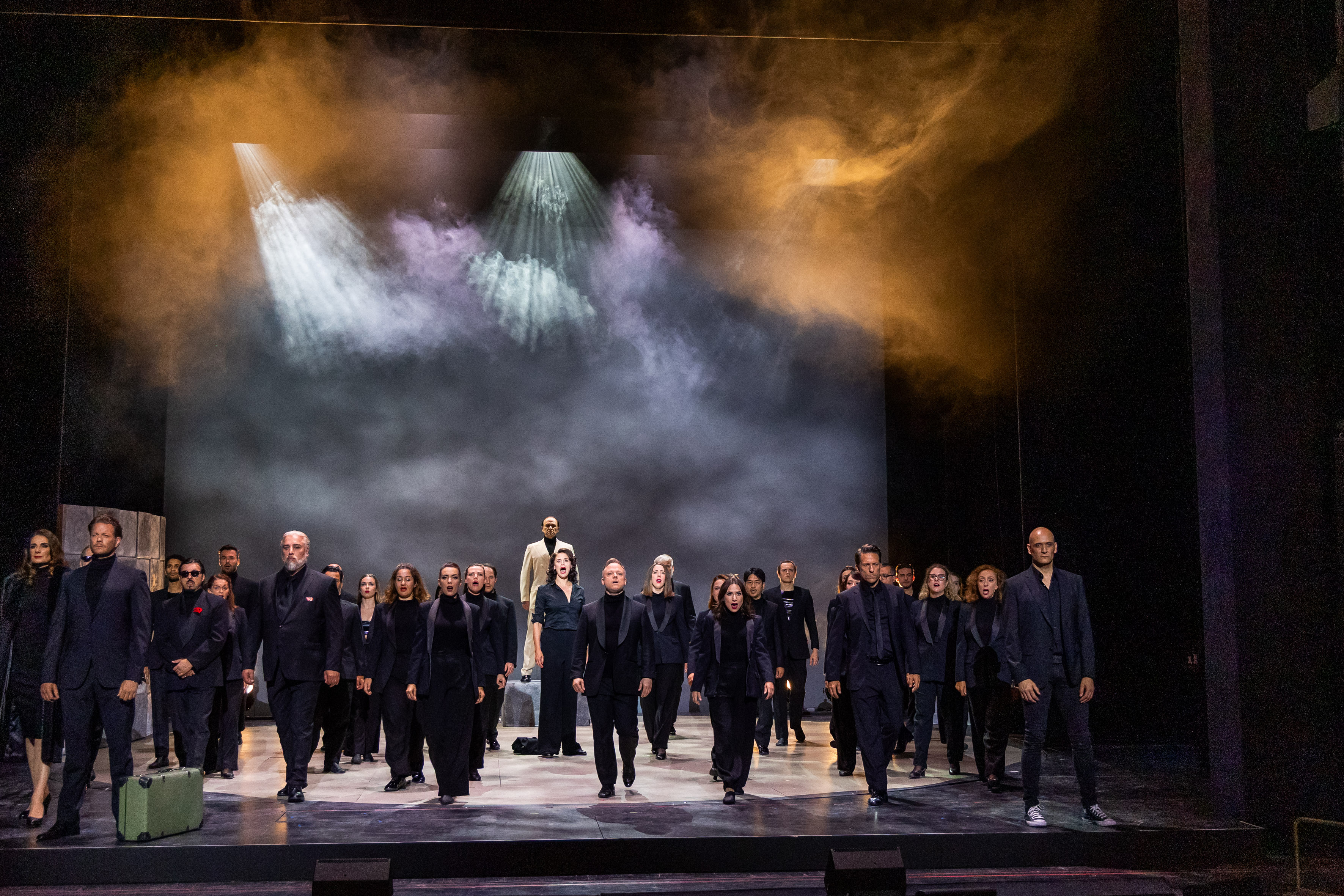 Das Kostümbild von Conny Lüders bleibt bewusst zeitlos und schlicht. Schwarz dominiert – nur der Schiedsrichter hebt sich in einem schneeweißen Anzug ab und fällt so auch optisch auf als übergeordnete Instanz, die das Spiel überwacht und immer wieder durch die Handlung führt. Seine spirituelle Überhöhung findet im thailändischen Tempelbild des zweiten Aktes eine visuelle Fortsetzung, wo er als sitzender Buddha inszeniert wird. Für die Choreografien ist Till Nau verantwortlich, der eine überraschend große stilistische Bandbreite auf die Bühne bringt. Das Ballettensemble der Bühne Baden ist nahezu durchgehend im Einsatz – ob in klassischem Tanz, Showelementen oder modernen Bewegungsbildern. Besonders eindrücklich kommentieren sie als schwarz gewandete Figuren mit akrobatischen Hebungen und synchronen Formationen die Schachzüge der Protagonisten.