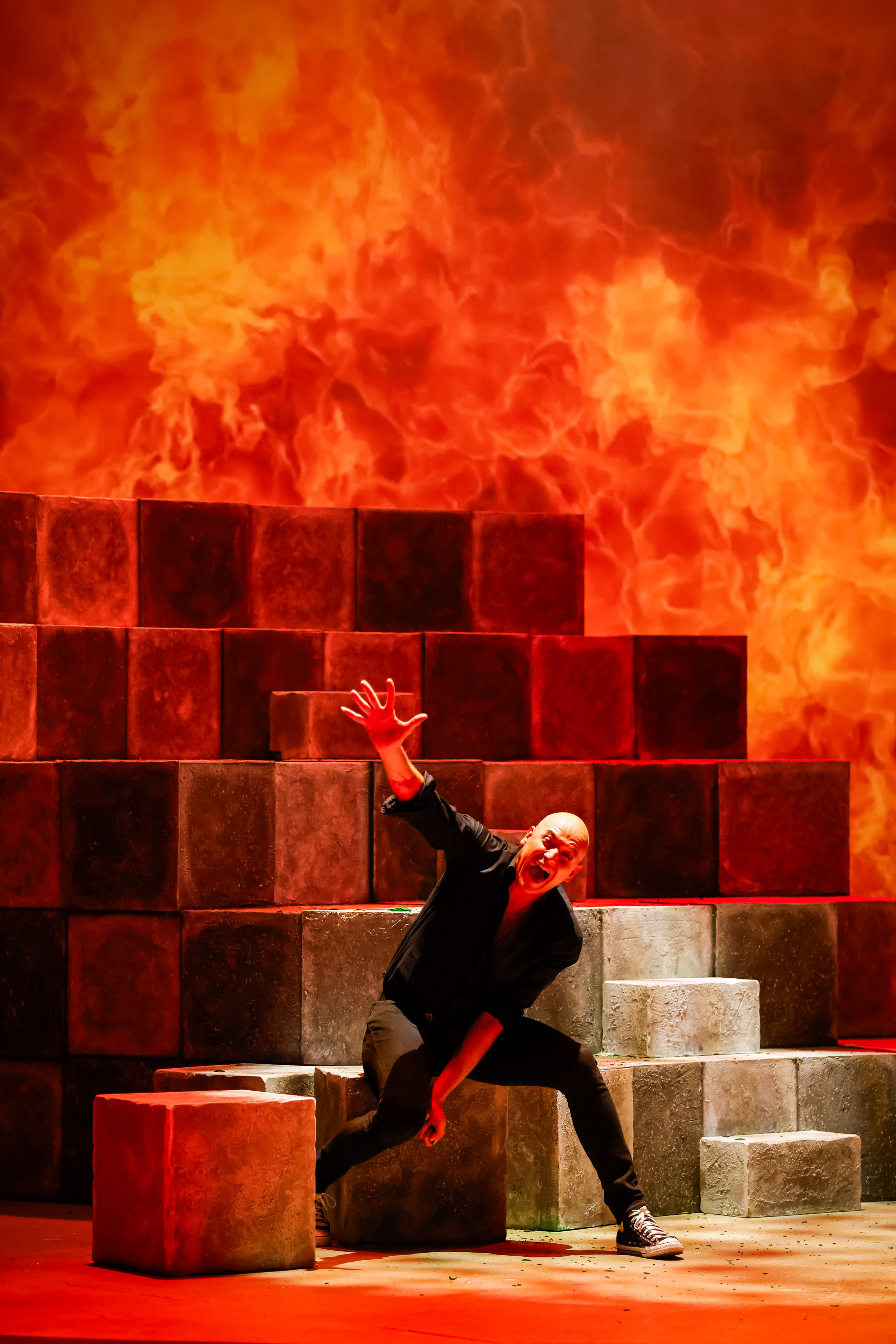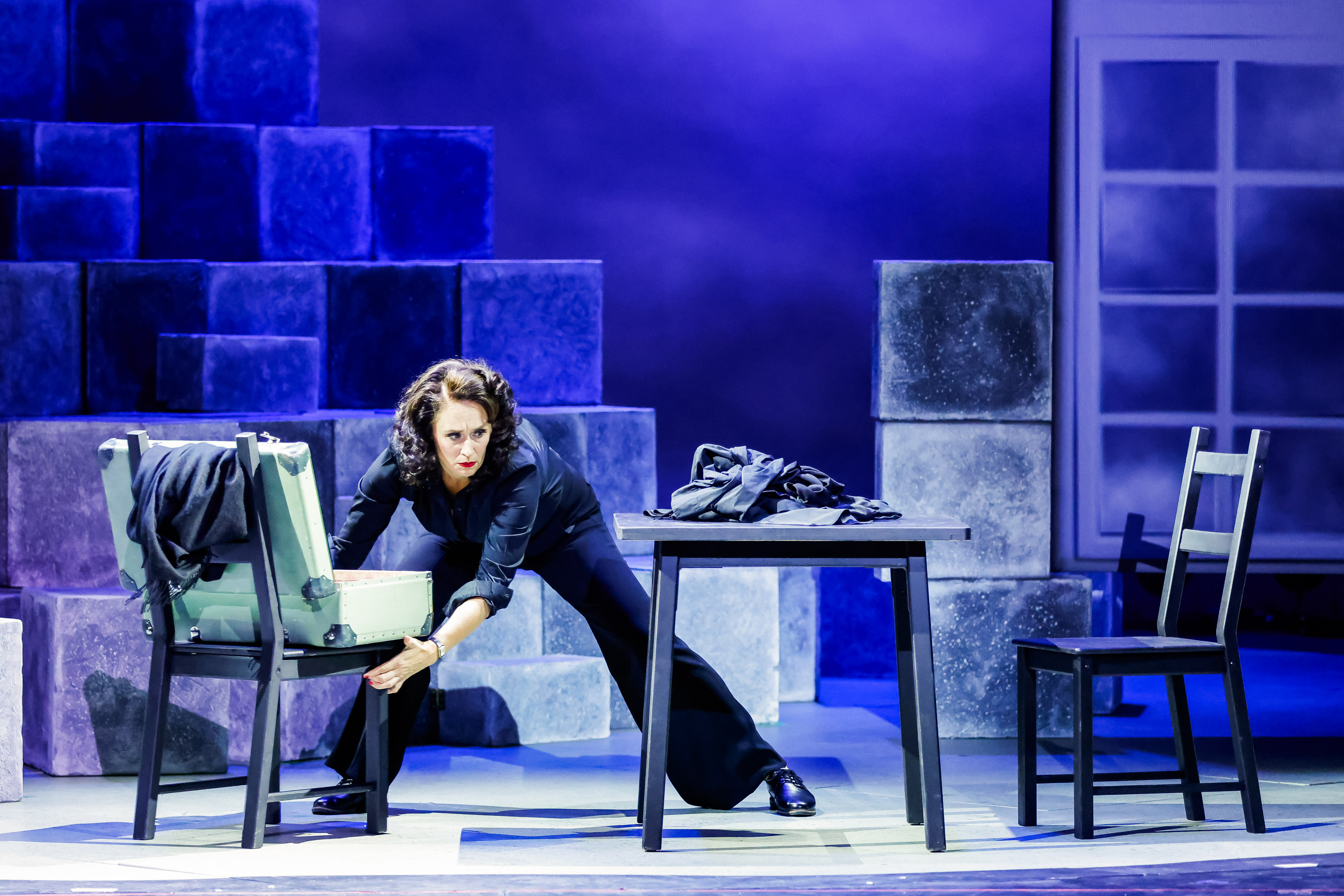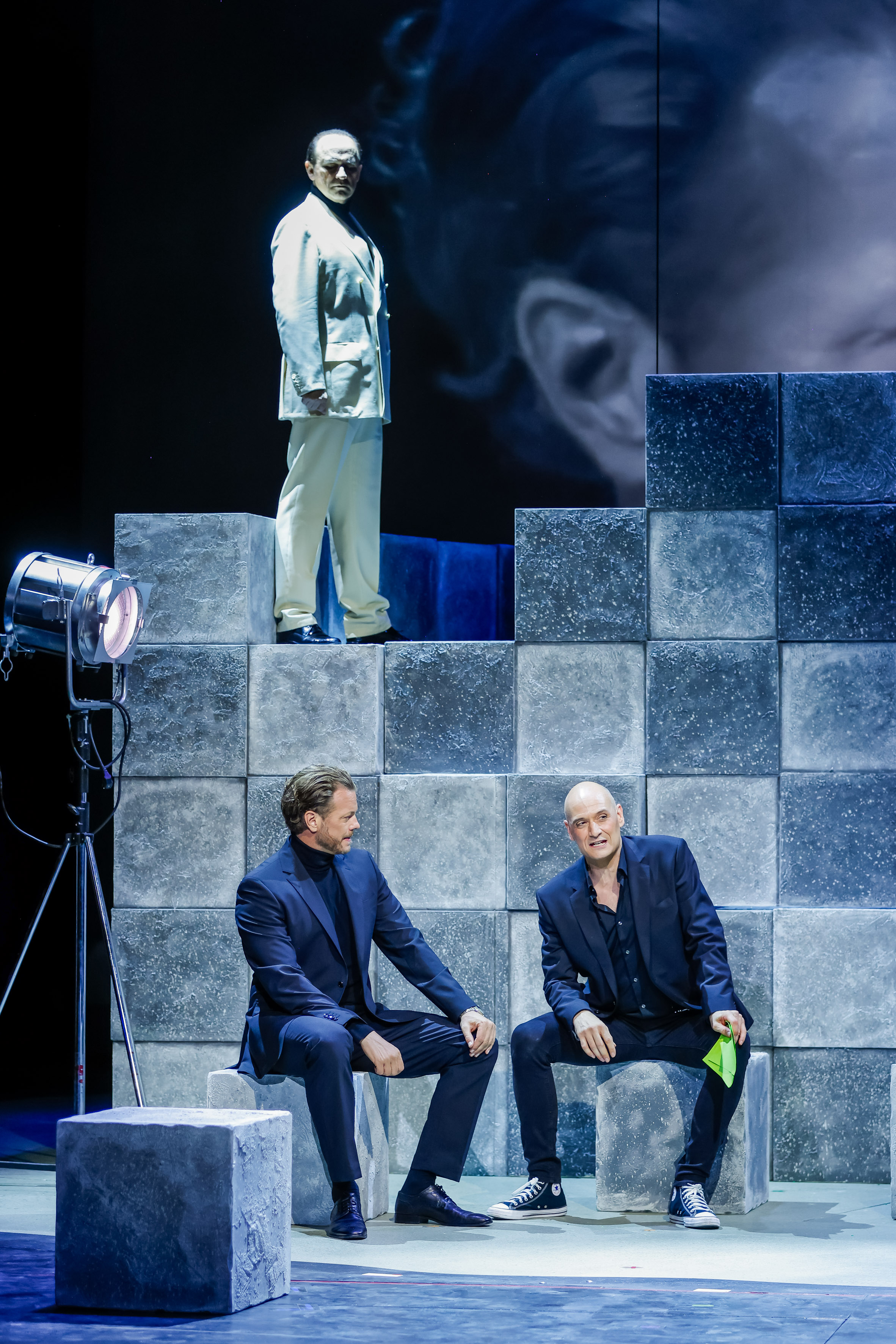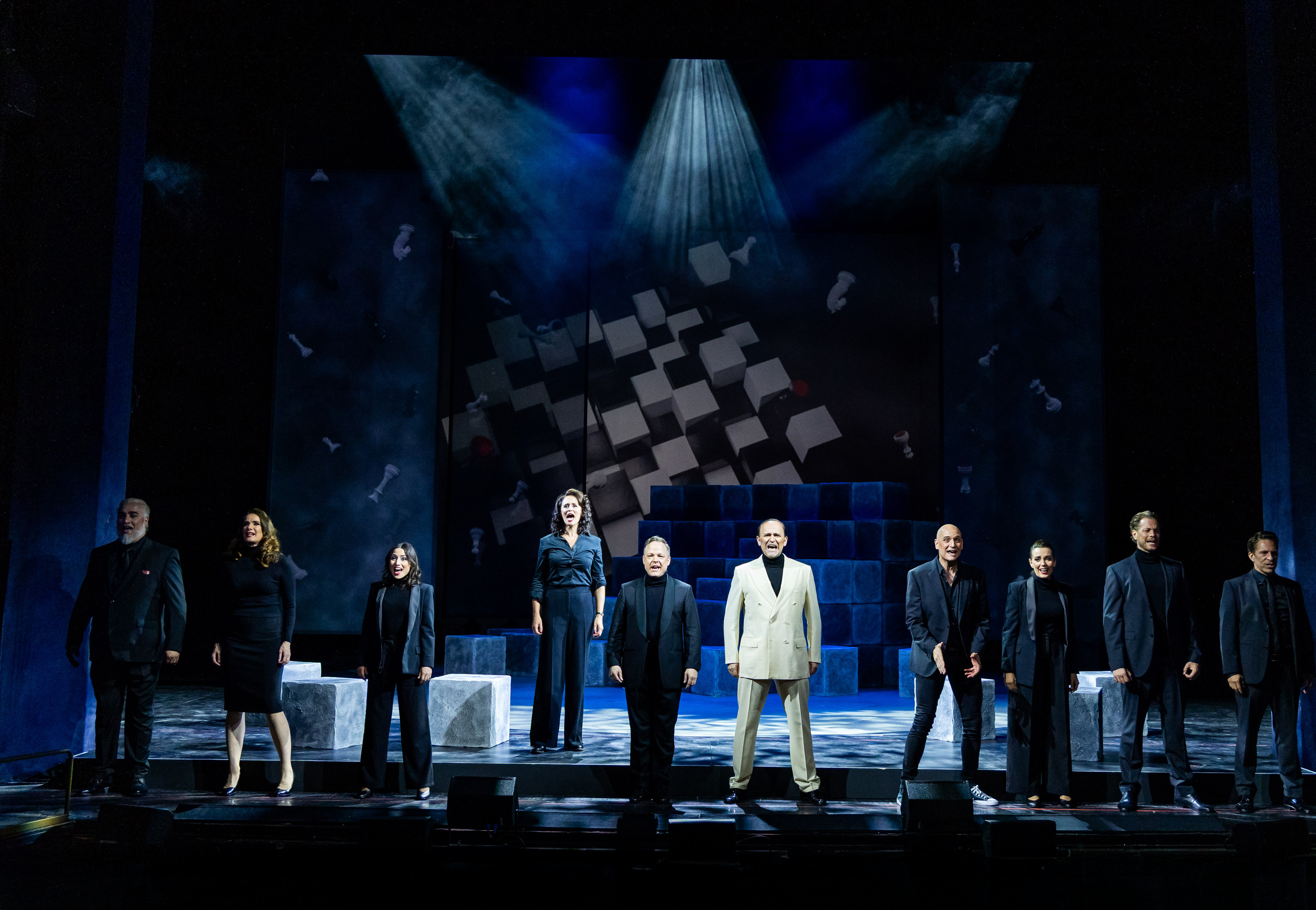 Dass Chess trotz seiner eindrucksvollen Musik nur relativ selten auf deutschsprachigen Bühnen zu sehen ist, liegt vor allem an der Schwierigkeit, das Buch wirkungsvoll auf die Bühne zu bringen. Trotz zahlreicher Überarbeitungen bleibt die Handlung komplex, überladen und nicht immer leicht nachvollziehbar. Politische Intrigen, private Verstrickungen und symbolische Überhöhungen wirken oft eher konstruiert als stringent erzählt. Besonders im ersten Akt fehlt es dem Stück an klarer Führung, während sich die dramatische Zuspitzung erst im zweiten Akt entfaltet. Umso bemerkenswerter ist es, wie Andreas Gergen diese strukturellen Schwächen durch eine stringente Regie auffängt und eine schlüssige, packende Inszenierung formt. Ohne das Buch zu verändern, gelingt es ihm, die Handlung klar zu gliedern und den Figuren emotionale Tiefe zu geben. Seine Regiearbeit zeigt, wie viel sich mit kluger Personenführung und präziser Bildsprache erzählen lässt.Gergen erzählt seine Geschichte in einem abstrakten Bühnenbild von Momme Hinrichs. Grautonige Quader, angeordnet wie Schachfelder, formen ein wandelbares Podium, das je nach Perspektive neue Räume schafft. Eine zweite, von oben einschwebende Formation, kombiniert mit einer semi-transparenten Gaze-Rückwand, wird zur Leinwand für Videoanimationen, die Orte und Themen der Handlung visuell unterstreichen. Immer wieder entstehen dabei starke Bilder – etwa wenn Florence während einer Schachpartie in Flashbacks auf ihr Leben blickt, sich selbst am Schachbrett sieht und nur für sie sichtbar ihrem Vater begegnet, der im Ungarischen Volksaufstand von 1956 ums Leben kam. Solche Momente fügen sich nahtlos in Gergens reduzierte, auf Figuren fokussierte Erzählweise ein und geben der Inszenierung Tiefe, ohne sie zu überfrachten.
