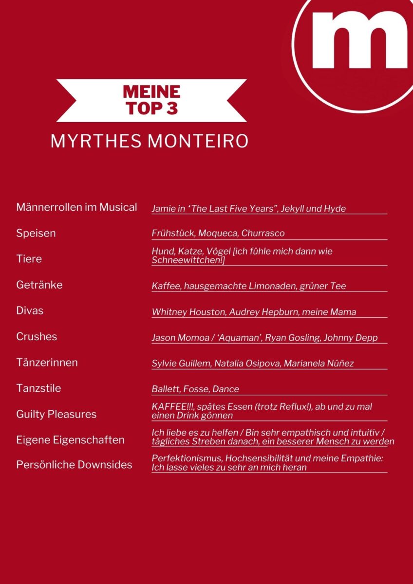 Dass Myrthes Monteiros Weg sie auf die Bühne führen würde, stand quasi bereits im Mutterleib fest, wie uns die sympathische Brasilianerin verrät. Myrthes, die spätestens seit ihrer Rolle als Prinzessin Jasmin in Disney’s „Aladdin“ in der deutschsprachigen Musicalszene bekannt ist, erzählt uns in diesem sehr persönlichen Interview nicht nur vom Stellenwert der Musik und des Tanzens in ihrem Leben, sondern auch von ihrem Umgang mit Schicksalsschlägen und dem harten Alltag in Brasiliens Musicalszene. Was sie alles schon in jungen Jahren geleistet und gelernt hat, ist ebenso beeindruckend wie Myrthes‘ stets positiver Blick auf das Leben.