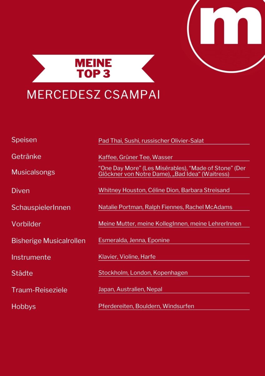 Mercedesz Csampai ist, seitdem sie bei „Tanz der Vampire“ die Erstbesetzung der Sarah übernahm, immer wieder bei deutschsprachigen Produktionen in großen Hauptrollen zu erleben, unter anderem als Esmeralda im „Glöckner von Notre-Dame“ und in Kürze als „Eiskönigin“ Elsa. Darüber hinaus hat Mercedesz aber auch zahlreiche Erfahrungen in der skandinavischen Musicallandschaft, beispielsweise bei „Waitress“ gesammelt und stand in Russland als Christine Daaé auf der Bühne. Ihr West End-Debüt gab sie als Yocheved in der Uraufführung des Musical-Epos „Prince of Egypt“ . Die sympathische Darstellerin schaut mit uns auf ihren bisherigen Weg zurück, wagt aber auch einen Blick in die Zukunft, erzählt uns von ihren Traumrollen und von den Herausforderungen, denen sie in ihrer Karriere begegnet ist.