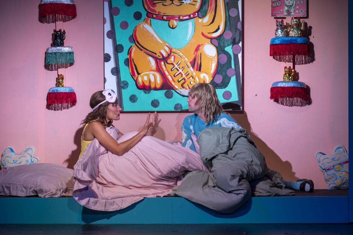 Dorothée Kahler, Michael Kargus und Evangelos Sargantzo wechseln im Minutentakt ihre Figuren. Sie geben diesen vielen Charakteren kleine Eigenheiten mit – ob das nun Beas Tanten und Onkel sind, der Sexshop-Verkäufer mit dem hessischen Akzent, die Träger des Umzugsunternehmens ‚von dannen‘ oder Beas High-Society-Mutter. Selbst Figuren mit kurzen Bühnenmoment werden plastisch. Dabei helfen ihnen die fantastischen bunten Kostüme und Perücken von Gesa Lüthje, die perfekt auf die Charaktere abgestimmt sind.