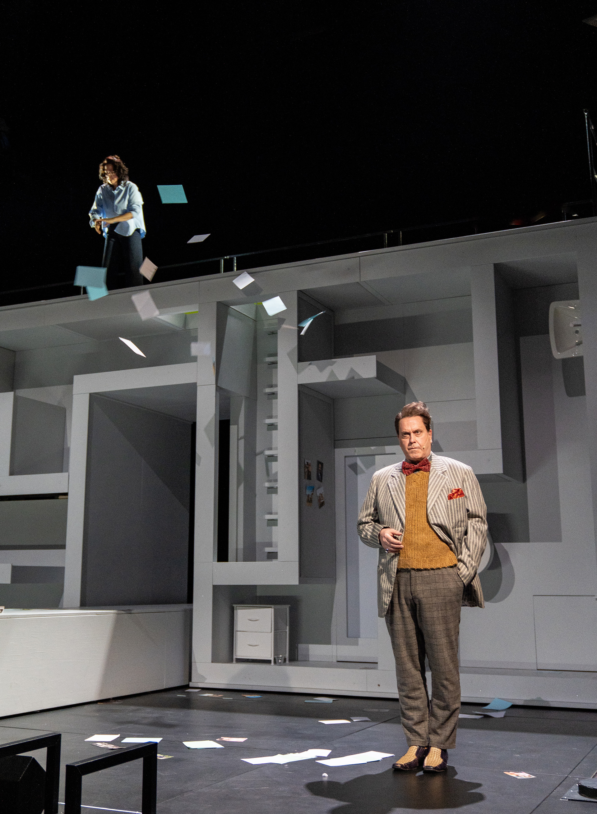 Das eigentliche Lichtdesign von Philipp Sonnhoff synergiert sehr schlüssig mit dem Bühnenbild. So werden zum Beispiel die einzelnen Räume in der Wohnungswand separat beleuchtet, als würde die Person, die sich darin befindet, das Licht einschalten. Dazu kommen gut platzierte und nicht überdosierte Lichteffekte.