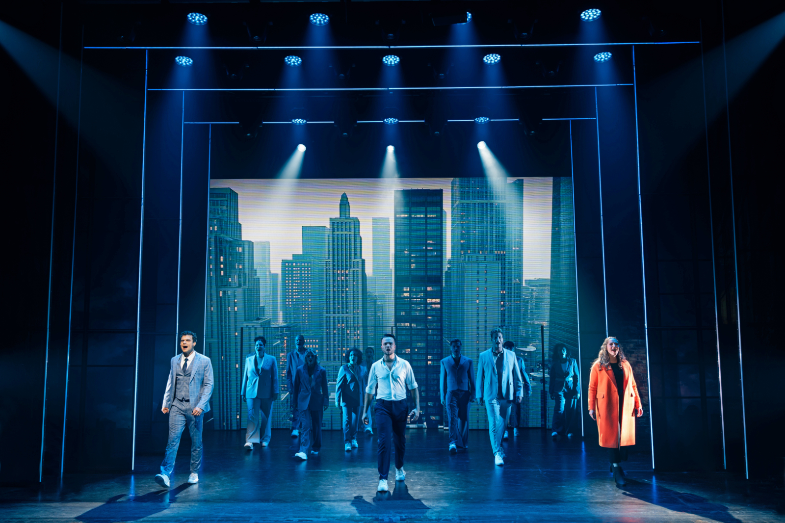 Visuell beeindrucken die Video- und LED-Projektionen von Girgory Shkylar, die sowohl Bewegungen nachahmen als auch verschiedene Perspektiven eröffnen: Es entsteht beispielsweise der Eindruck, dass der gläserne Fahrstuhl im Hintergrund tatsächlich auf die Skyline von New York blicken lässt – und zwar aus der Aufwärtsbewegung des Fahrstuhls heraus fortlaufend aus angepasster Perspektive. Dieses ausgeklügelte LED-Design schafft eigene Maßstäbe für eine projizierte Set-Gestaltung: Gerade bei Tourinszenierungen stellen Projektionen ein sicheres gestalterisches Element dar, da sie zuverlässig auf jeder Bühne funktionieren. Die Projektionen Shkylars dominieren das Set-Design nach Sam Madwar: Bewegliche Bühnenelemente, die ebenfalls mit Videos und Standbildern bespielt werden, lassen im Handumdrehen schnelle Szenenwechsel reibungslos vonstatten gehen. Es braucht somit nicht viele Requisiten, die die Szene verändern, um vom heimeligen Wohnraum mit grünem Sofa und rotem Kühlschrank zum kalten Bürogebäude, in die U-Bahn oder ins Stehcafé zu wechseln. Außerdem finden die tödlichen Schüsse im Verborgenen hinter den beweglichen Elementen statt. So können zeitgleich Leiche und Geist dargestellt werden, indem beispielsweise zwei Sams hinter der beweglichen Kulisse auftauchen.